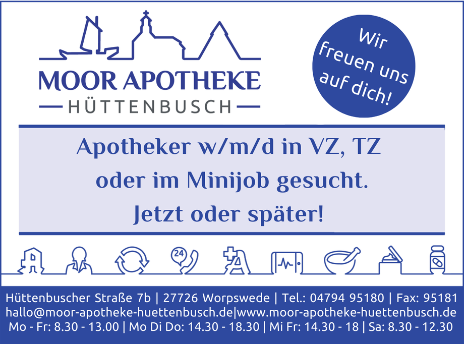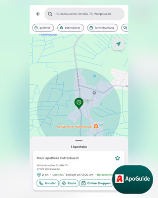 Die Moor Apotheke Hüttenbusch (früher Regenbogen Apotheke) in Worpswede-Hüttenbusch gibt es seit 1997. Das Geschäftshaus mit Volksbank und Bäcker wurde auf dem Gelände der alten Mühle gebaut. Es liegt an der Hauptstraße, ist gut zu erreichen und hat ausreichend Parkmöglichkeiten.